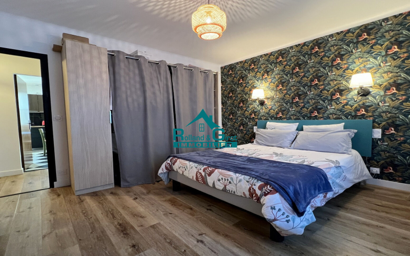 Une entrée desservant une grande cuisine dinatoire aménagée et équipée de 22 m², un salon-séjour lumineux exposé Sud-Ouest, une chambre parentale, salle d'eau, wc