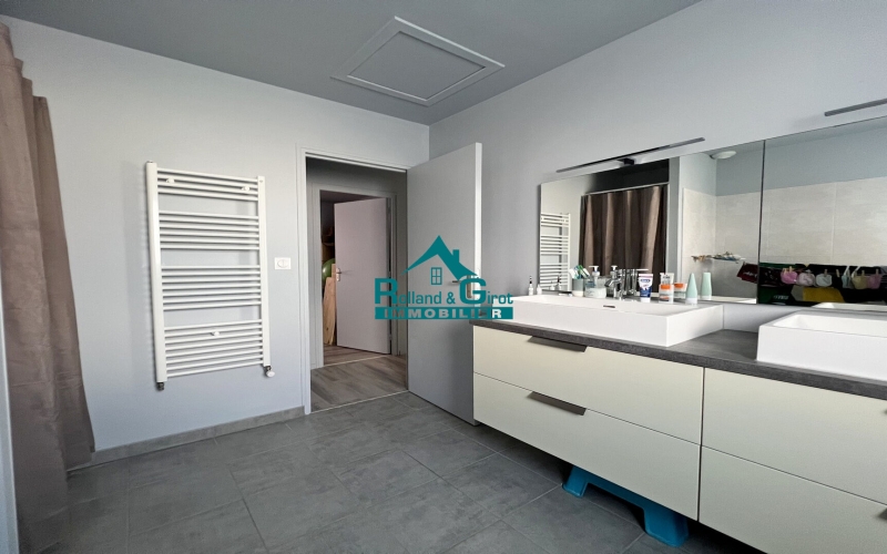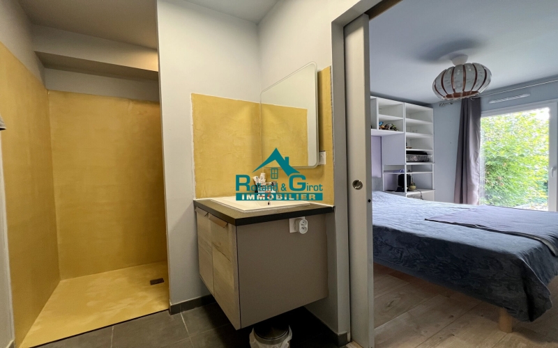 La chambre parentale tournée vers l'extérieur, avec sa salle d'eau privative, vous offre un espace de tranquillité.