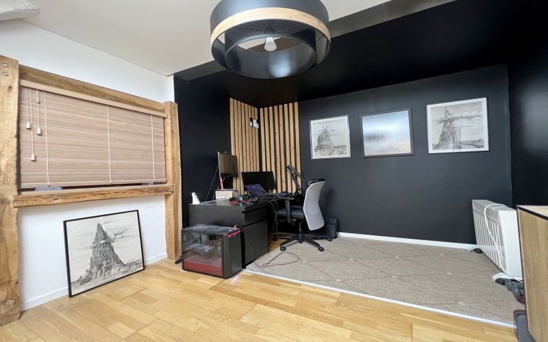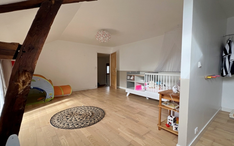 A l'étage, un grand palier dessert un bureau de 10 m² pouvant devenir une cinquième chambre, une salle d'eau avec douche à l'italienne et WC, ainsi que trois chambres de beaux volumes (19 m², 17 m² et 13,5 m²).