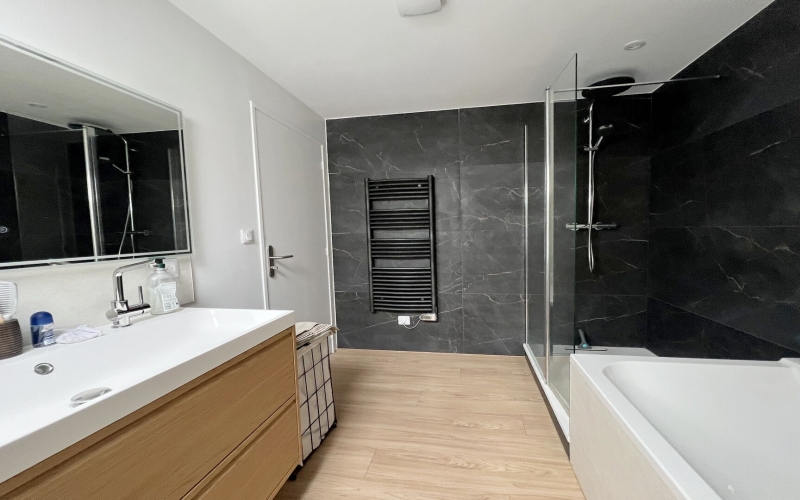 Au rez-de-chaussée, vous trouverez une belle pièce de vie lumineuse comprenant salon, salle à manger et cuisine ouverte aménagée et équipée, une suite parentale avec baignoire et douche, une buanderie fonctionnelle ainsi que des WC séparés.
