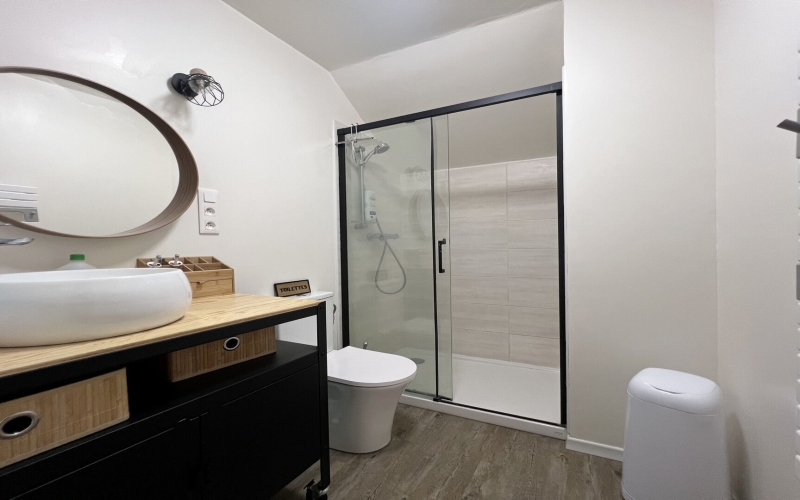 A l'étage, un grand palier dessert un bureau de 10 m² pouvant devenir une cinquième chambre, une salle d'eau avec douche à l'italienne et WC, ainsi que trois chambres de beaux volumes (19 m², 17 m² et 13,5 m²).