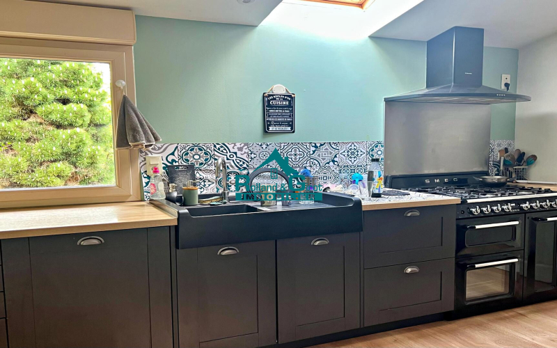 La cuisine aménagée et équipée s'ouvre sur un salon-séjour lumineux, exposé plein sud, avec une cheminée à insert pour une ambiance chaleureuse toute l'année.