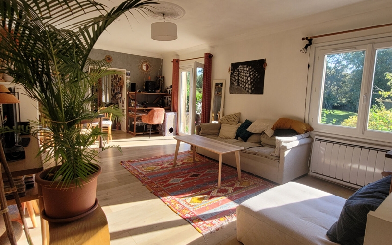 Un lumineux salon-séjour donnant accès à une terrasse exposée plein Sud.