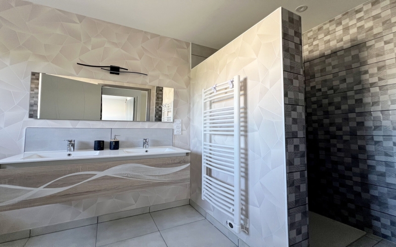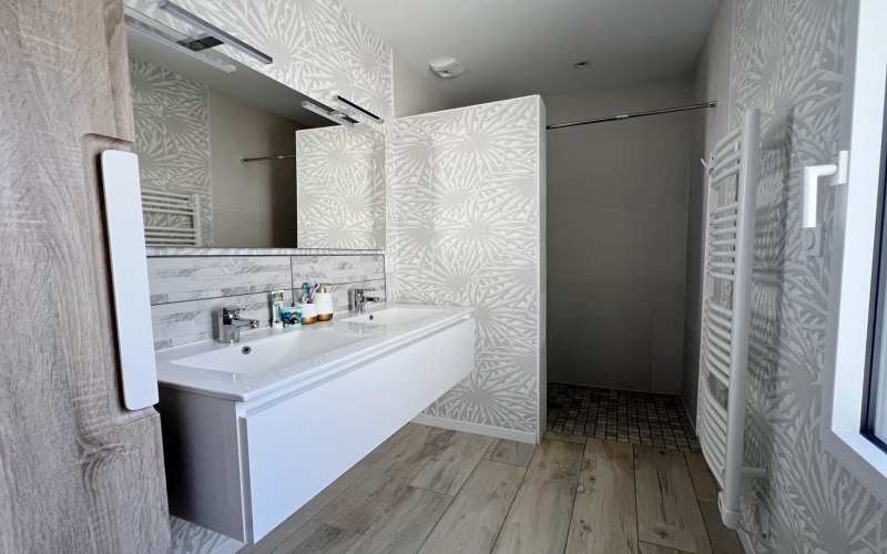 A l'étage, l'espace nuit propose trois chambres avec dressing et une salle de bains avec douche et baignoire, idéale pour toute la famille.
