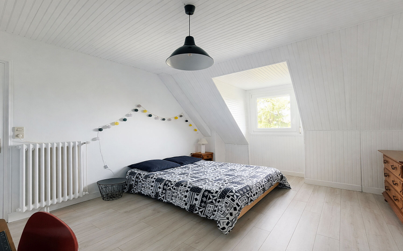 A l'étage, vous trouverez un palier desservant un grenier, deux chambres dont une avec une salle d'eau et un w.c.