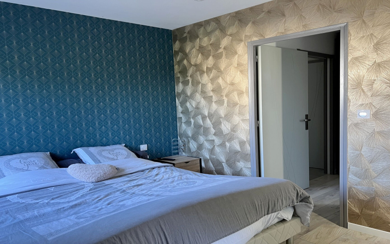 A l'étage, l'espace nuit propose trois chambres avec dressing et une salle de bains avec douche et baignoire, idéale pour toute la famille.