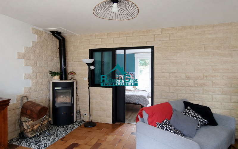 Elle comprend, au rez-de-chaussée : une entrée desservant un bel espace salon-séjour avec poêle à bois, une cuisine aménagée et équipée attenante, une chambre ainsi qu'une salle d'eau avec WC, permettant une vie de plain-pied.