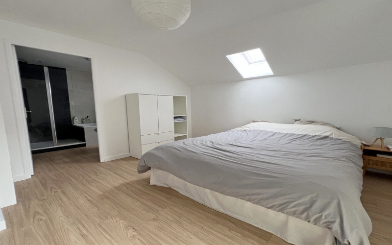 A l'étage, un grand palier dessert un bureau de 10 m² pouvant devenir une cinquième chambre, une salle d'eau avec douche à l'italienne et WC, ainsi que trois chambres de beaux volumes (19 m², 17 m² et 13,5 m²).