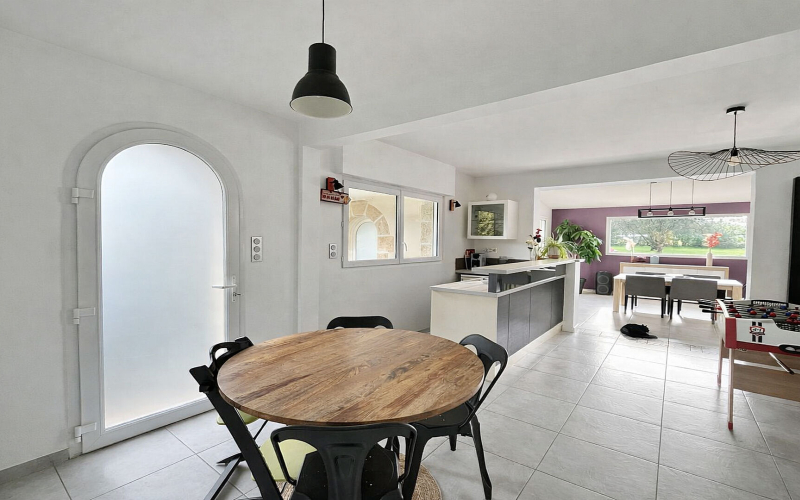 Le rez-de-chaussée s'ouvre sur un vaste salon-séjour d'environ 60 m², baigné de lumière et pensé pour recevoir dans une atmosphère chaleureuse et contemporaine. Une cuisine moderne, entièrement équipée et aménagée avec soin, complète cet espace de vie convivial.