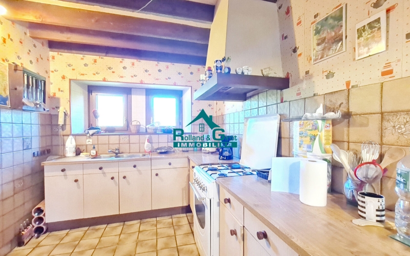 Au rez-de-chaussée, une cuisine aménagée, ouverte sur un salon/séjour avec des poutres et des pierres apparentes et son poêle à granules, vous permettra de passer des moments conviviaux en famille. De l'autre côté de la cuisine, une buanderie avec WC peut encore évoluée en pièce supplémentaire ou bien être aménagée en suite parentale.