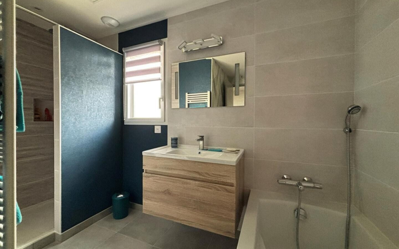 A l'étage, trois chambres accueillantes ainsi qu'une salle de bains avec douche et baignoire offrent un espace nuit parfaitement adapté aux enfants ou aux invités
