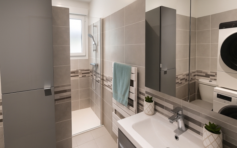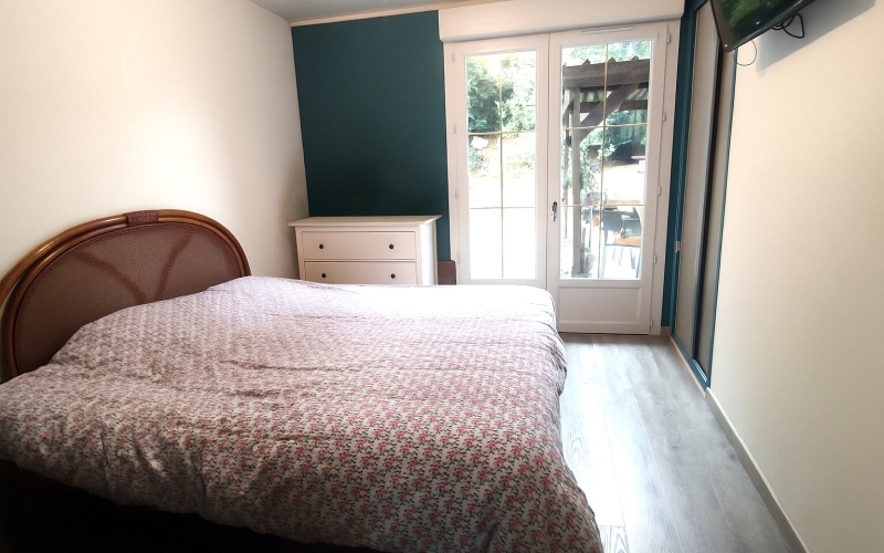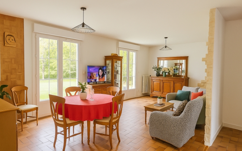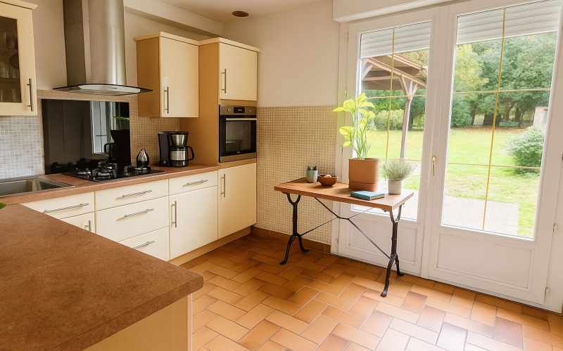 Elle comprend, au rez-de-chaussée : une entrée desservant un bel espace salon-séjour avec poêle à bois, une cuisine aménagée et équipée attenante, une chambre ainsi qu'une salle d'eau avec WC, permettant une vie de plain-pied.