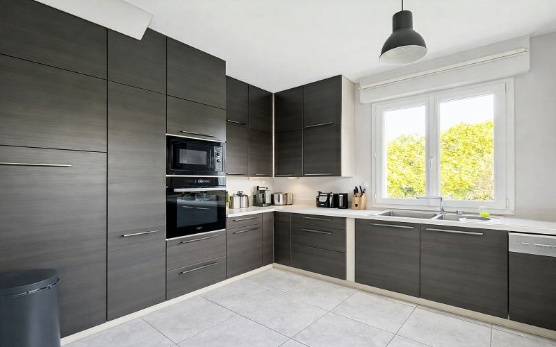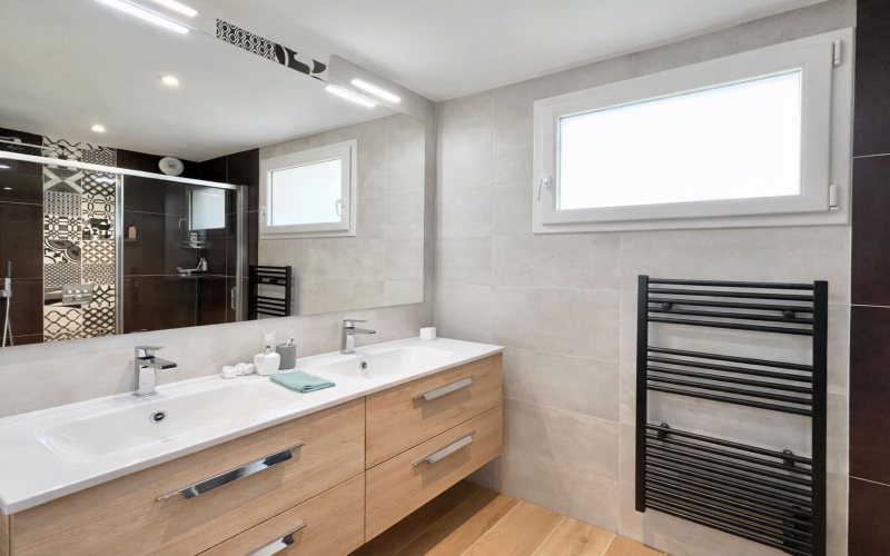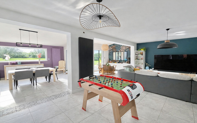 Le rez-de-chaussée s'ouvre sur un vaste salon-séjour d'environ 60 m², baigné de lumière et pensé pour recevoir dans une atmosphère chaleureuse et contemporaine. Une cuisine moderne, entièrement équipée et aménagée avec soin, complète cet espace de vie convivial.