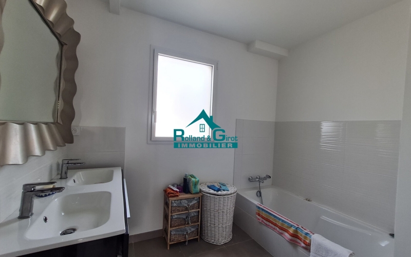 Au rez-de-chaussée, vous trouverez une entrée amenant sur un bel espace de vie de 40 m² baigné de lumière, comprenant un salon/séjour ouvrant sur une terrasse plein Sud , une cuisine aménagée et équipées, une buanderie, un WC indépendant avec lave mains et une suite parentale avec chambre et salle de douche attenant offrant une vie d plain-pied. Les grandes baies vitrées donnent une luminosité naturelle et donnent accès à un jardin de 350 m² idéalement exposé SUD.