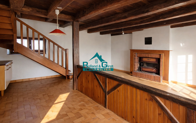 RDC : cuisine ouverte sur séjour avec cheminée, WC, buanderie.