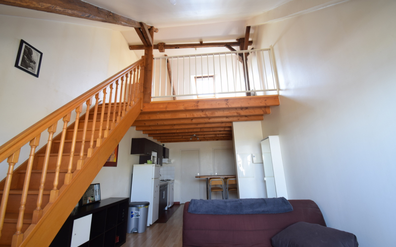 Dans un immeuble de caractère situé en centre-ville de Liffré, appartement de type 2 duplex exposé au Sud, comprenant au 1er niveau : cuisine aménagée et équipée ouverte sur séjour, salle d'eau, WC séparé. Au 2ème niveau : chambre en mezzanine. Place de parking.